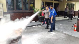 Pada bagian praktek, sejumlah personil mencoba memadamkan api menggunakan APAR, bahkan Kapolres pun ikut mencoba menggunakan alat semprot APAR ini.