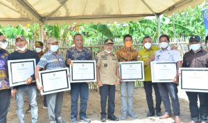Penyerahan Piagam Penghargaan Penanganan Rehabilitasi Rumah Tidak Layak Huni bagi masyarakat berpenghasilan rendah dan rumah korban bencana Tingkat Kabupaten Jeneponto Tahun Anggaran 2021 di pusatkan di Kelurahan Balang Toa Kecamatan Binamu.