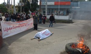 Puluhan massa aksi yang tergabung dalam APM Se-Kabupaten Enrekang membawa keranda bertuliskan copot kapolres serta membakar ban bekas dan berorasi secara bergantian.