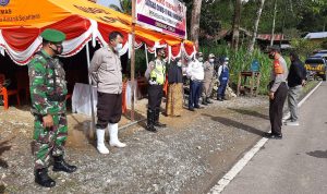 Bhabinkamtibmas Desa Pana Bripka Putu Budiarsa yang tergabung dalam Sprin Pos Penyekatan Arus Mudik melaksanakan Apel pagi di Jalan raya Perbatasan Enrekang – Toraja Desa Pana Kecamatan Alla kabupaten Enrekang.