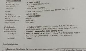 “Telah terjadi tindak pidana membuat/menyebarkan berita bohong (hoaks) yang dilakukan Terlapor dengan cara menulis dan memfosting berita dengan judul “Tidak Terima Lurah di Copot, Warga Sandera Wakil Bupati Jeneponto” melalui media sosial Facebook pada group SURAT (Suara Rakyat Turatea).” bunyi laporan tersebut.
