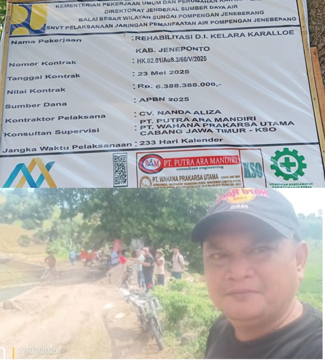 JENEPONTO — CAKRAWALAINFO.COM | Pengerjaan proyek rehabilitasi saluran irigasi Kelara-Karalloe di Kabupaten Jeneponto kembali menuai sorotan tajam. Proyek senilai Rp6,38 miliar yang bersumber dari Kementerian Pekerjaan Umum dan Perumahan Rakyat melalui Balai Besar Wilayah Sungai (BBWS) Pompengan Jeneberang ini diduga dikerjakan asal jadi tanpa mematuhi standar teknis.